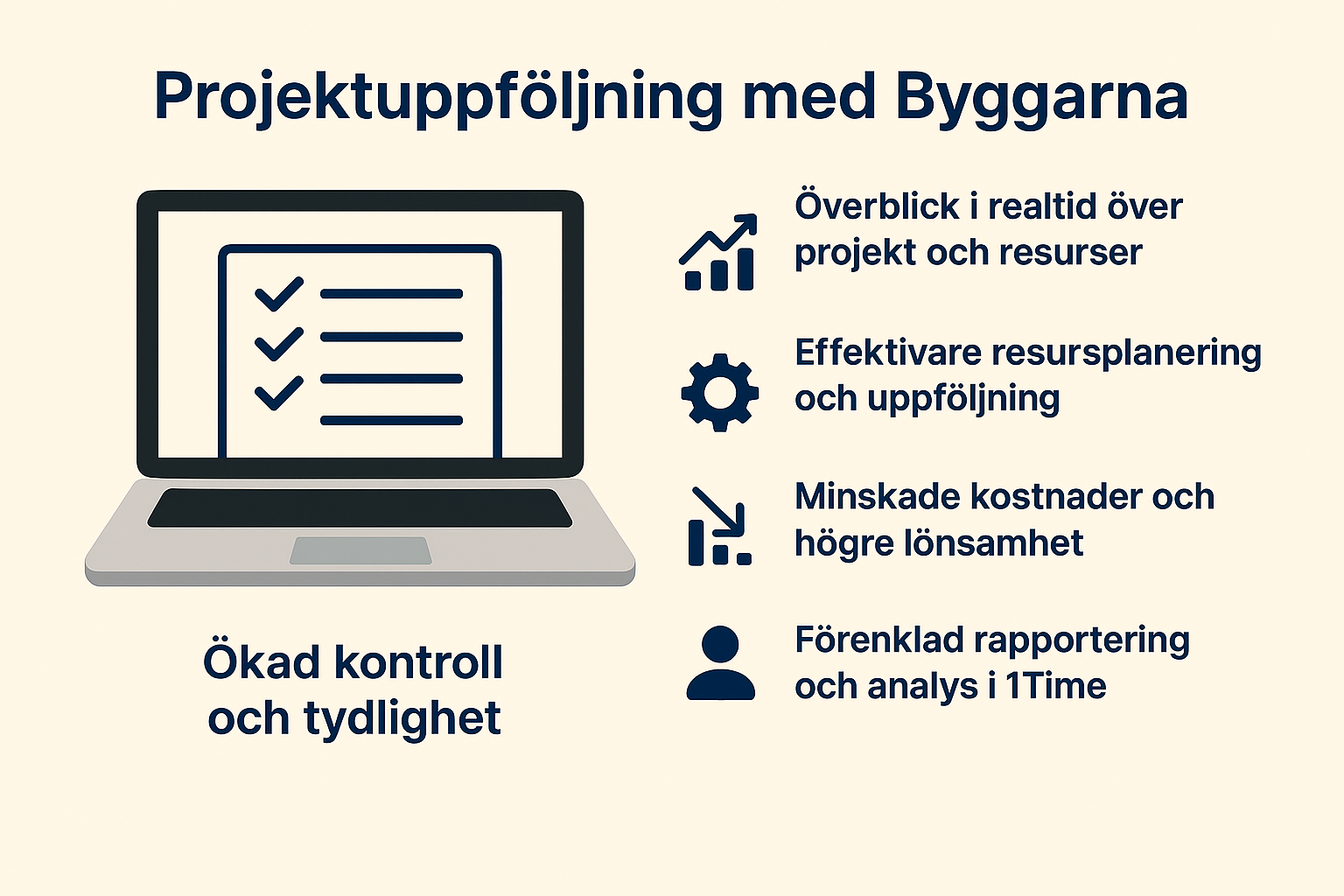 I Byggarnas Tidrapportering får du full koll på dina byggprojekt – i realtid. 📍 Se och jämför alla projekt på ett ställe ⏱ Följ timmar, material och utgifter 💰 Få snabb överblick över lönsamheten Du ser direkt hur varje projekt ligger till, både i tid och kostnad. Hur gör ni idag för att följa upp projekten? Excel, whiteboard eller app? Diskutera gärna i denna tråden eller läs mer om funktionen här: byggarna.se/tidrapportering Varför är det så viktigt med projektuppföljning?När du har bra koll på hur dina projekt går löpande, samt hur de har har gått historiskt så får du ett mycket bättre utgångsläge att fatta rätt beslut i ett tidigt skede. Blev utfallet som vi ville? Stäm av så att ditt utfall motsvarar den kalkyl du lämnade på arbetet och ta med dig eventuella erfarenheter in i nästa projekt. Vad tar vi med oss till nästa kalkyl? Missade du att få med kostnad för bortforsling? Eventuella missar från projektet tas med som en lärdom in i nästa projekt. Fördelar med projektuppföljning app inom byggNär du har bra koll på hur dina projekt går löpande, samt hur de har har gått historiskt så får du ett mycket bättre utgångsläge att fatta rätt beslut i ett tidigt skede. Kontroll i realtidAppen visar omgående hur projekten ligger till jämfört med budget – både timmar och material. Detta gör det möjligt att snabbt se ofakturerat arbete och vidta rätt åtgärder innan kostnaderna skenar iväg. Tydlig historik för lärande och kalkyleringAlla tidigare projekt sparas i molnet. Du kan enkelt analysera resultaten i efterhand och använda erfarenheter (som missade kostnader för bortforsling) som underlag för mer exakta kalkyler i framtiden. Prognoser för kommande behovMed prognosfunktionen kan du se bokade timmar och se om du har tillräckligt med personal inför kommande projekt. Appen hjälper dig att identifiera behov av omfördelning av resurser i god tid. Effektiv kommunikation och beslutstödGenom att följa utfall, historik och prognoser i samma gränssnitt får du ett komplett beslutsunderlag och kan agera snabbt. Du får tidiga signaler på när något behöver justeras, vilket sparar både tid och pengar. Underlättar projektuppföljning och personalhanteringSystemet erbjuder moduler för projektuppföljning, där man kan jämföra utfall mot budget, samt personalhantering, inklusive närvaro och frånvaro. Genom att samla historik, nuläge och prognoser i en plattform får byggföretag bättre kontroll, ökad effektivitet och möjligheten att undvika onödiga kostnader. Sammanfattningsvis ger projektuppföljning med 1Time och Byggarna följande: Nytta Effekt Realtidsöversikt Tidiga insatser mot avvikelser Historik Bättre kalkyler och lärande Prognoser Proaktiv resursplanering Klicka här för att prova Byggarnas tidrapportering utan kostnad i 14 dagar!
