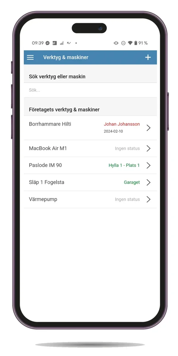 Medarbetare kan enkelt boka och registrera användning av maskiner och verktyg direkt i appen. Det är lätt att se vem som använder vilken utrustning och på vilket projekt. När arbetet är klart återlämnas utrustningen och tilldelas en lagerplats i appen.